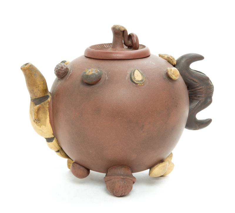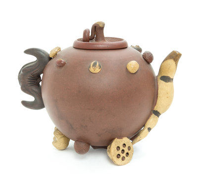 of globular form, the exterior applied with various peanuts, walnuts and lotus roots, a flying bat forming the handle and a long lotus root forming the spout, the circular cover in the shape of a mushroom.