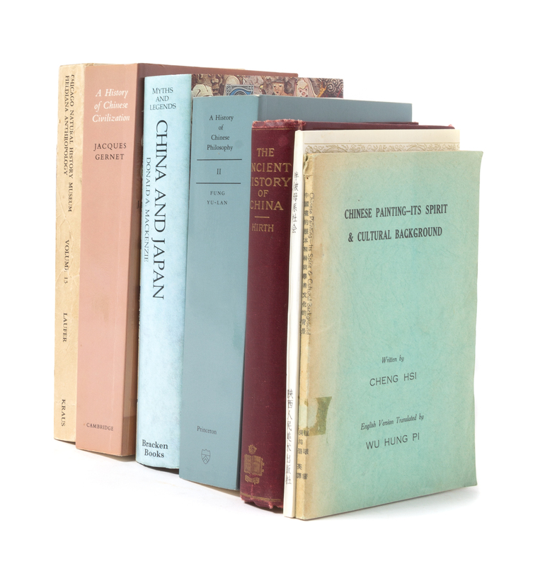 Scythian, Persian and Central Asian Art from the Hermitage Collection, Leningrad 1969; Volume XX 1966-1967; Tony Allan & Charles Phillips Land of the Dragon: Chinese Myth 2005; Wheatley Paul, The Pivot of the Four Quarters 1971; Kwan-wai So Japanese Piracy in Ming China During the 16th Century 1975; Cho-yun Hsu Edited by Jack L. Dull Han Dynasty Volume II: Han Agriculture: The Formation of Early Chinese Agrarian Economy (206 B.C.-A.D.220) 1980; Sven Hedin The Silk Road 1938; Y. C. Yuen A Guide to Cantonese (Self-Taught) 1958; Charles O. Hucker Michigan Papers in Chinese Studies Number 34: The Ming Dynasty: Its Origins and Evolving Institutions 1978; American art Association Anderson Gallerines, Inc. Sale Number 4449 Chinese and Japanese Objects of Art, Property of Prince Giovanni del Drago 1939; Fung Yu-lan translated by Derk Bodde A History of Chinese Philosophy Volume I: The Period of the Philosophers (from the beginnings to circa 100 B.C.) 1983; Fung Yu-lan transllated by Derk Bodde A History of Chinese Philosophy Volume II: The Period of Classical Learning (from the Second Century B.C. to the Twentieth Century A.D.) 1983; Edoardo Fazzioli translated by Geoffrey Culverwell Chinese Calligraphy, From Pictograph to Ideogram: The History of 214 Essential Chinese/Japanese Characters 1986; Cho-Yun Hsu Ancient China in Translation: An Analysis of Social Mobility, 722-222 B.C. 1965; Michael Loewe Everyday Life in Early Imperial China During the Han Period 202 B.C.-220 A.D. 1968; Arthur and Grace Chu Oriental Antiques and Collectibles, A Guide 1973; Friedrich Hirth The Ancient History of China to the End of the Chou Dynasty 1911; Publications of the Field Museum, Anthropological Series Volume XIII 1913-1914; Charles O. Hucker China's Imperial Past: An Introduction to Chinese History and Culture 1975; Donald A. Mackenzie China And Japan: Myths and Legends 1986; Jacques Gernet translated by J. R. Foster A History of Chinese Civilization 1982; Ann Paludan Chronicle of the Chinese Emperors: The Reign-by-Reign Record of the Rulers of Imperial China 1998; Hugo Munsterberg Art of the Far East 1968. Huynh Thi Duoc Cham Sculpture and Indian Mythology 2007; Gina L. Barnes China Korea and Japan: The Rise of Civilization in East Asia 1993; Clio Whittaker (editor) An Introduction to Oriental Mythology 1989; Jennine Auboyer & Roger Goepper The Oriental World 1967; Janet Gaylord Moore The Easter Gate: An Invitation to the Arts of China and Japan 1979; Gabriele Fahr Becker (editor) The Art of East Asia 1999; Zhao, Wenyi and Song, Peng Banpo Matriarchal Society 1994.