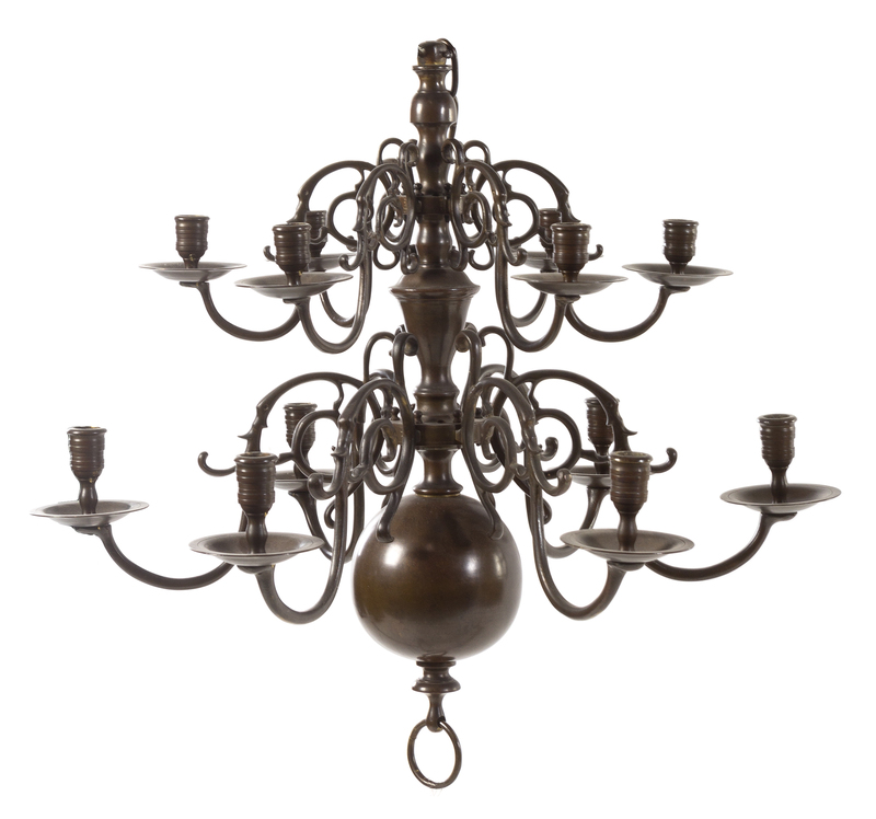 A Dutch Baroque Style Bronzed Metal Twelve-Light Chandelier Height 27 x diameter 26 1/8 inches.