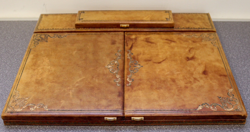 An Italian Gilt-Embossed Leather Travel Desk Top Width 19 3/4 inches.