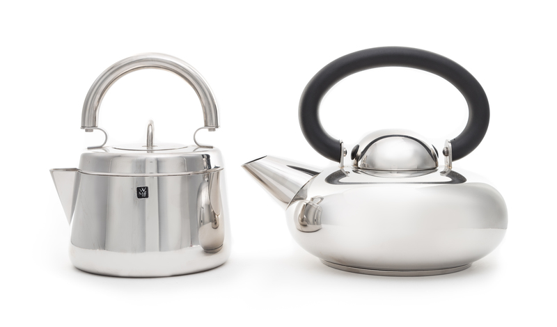 Two Stainless Steel Kettles Height of taller example 7 3/4 x width 9 1/2 inches.