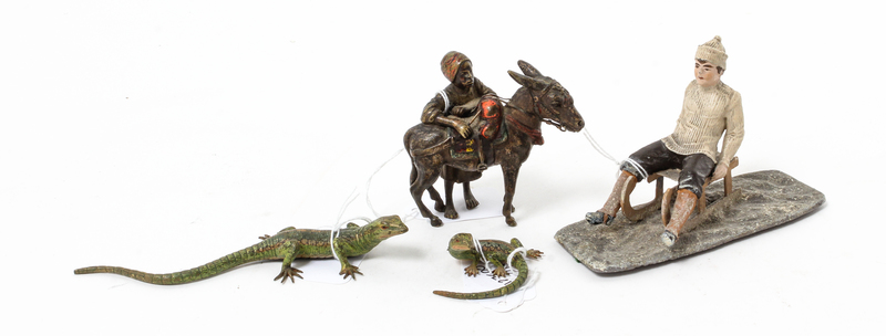 comprising an Austrian bronze example of a figure with a donkey, two lizards and a painted cast metal figure of a boy on a sled.