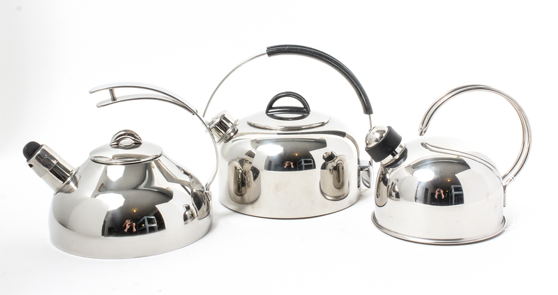 Three Stainless Steel Tea Kettles Height of tallest 8 1/4 inches.