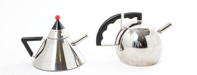 Two Stainless Steel Teapots Height of taller 5 5/8 x width 8 1/2 inches.