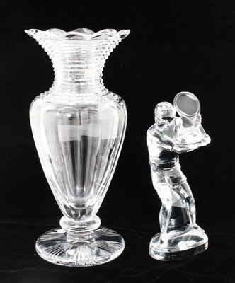 in the form of a tennis player, together with a William Yeoward cut glass vase.