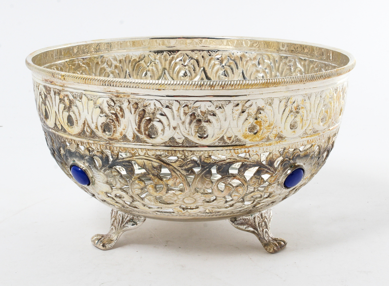 A Pakistani Hardstone Mounted Silvered Metal Bowl, , of circular footed form with pierced decoration, together with a fitted box.