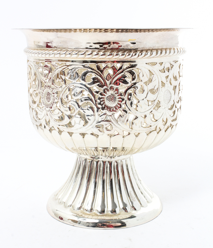 A Repousse Decorated Silvered Metal Bowl, , raised on a circular foot.