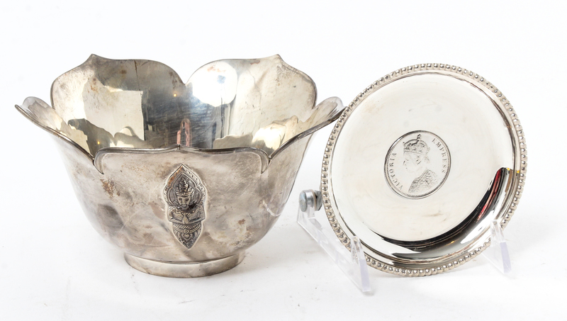 Two Silver Articles, 20th Century, comprising a lotus form bowl and circular tray inset with a coin.