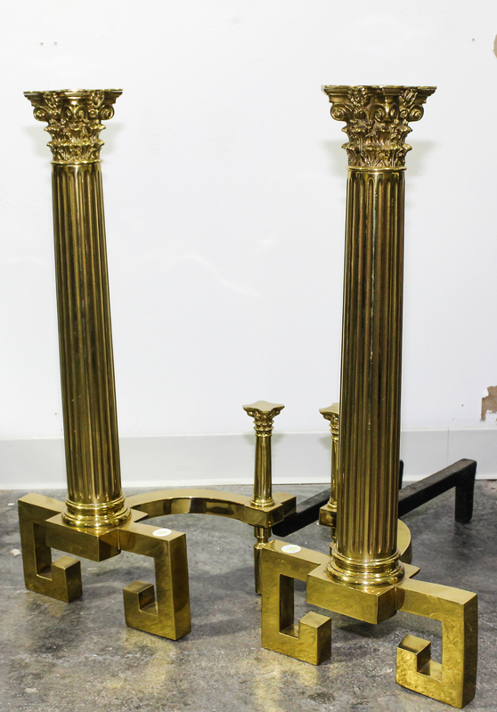 A Pair of Neoclassical Style Brass Andirons Height 27 inches.