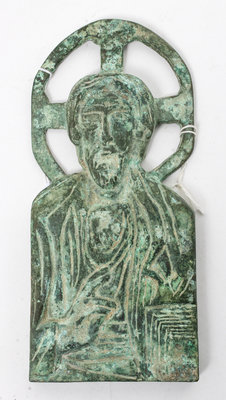 An Eastern European Patinated Metal Icon Height 10 inches