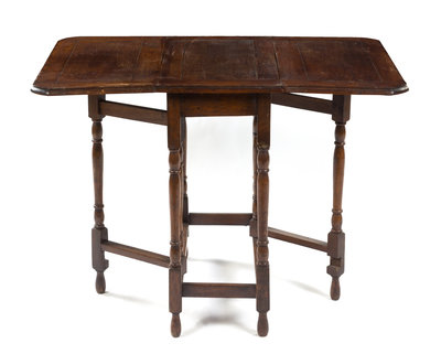 having a rectangular top with rectangular leaves above the plain frieze, raised on turned cylindrical legs and two gate legs.