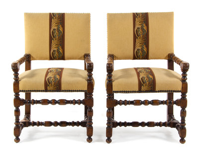 A Pair of Jacobean Rival Open Armchairs Height 39 inches overall.