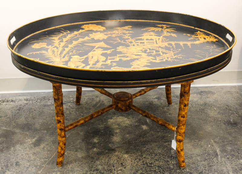 for Scalamandre, painted with scenes from Pillement toile, with a faux bamboo stand for use as a table.