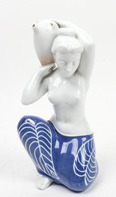 in the form of a kneeling woman holding a vessel, with blue waves mark in underglaze blue and various transfer printed, painted and impressed marks to the underside.
