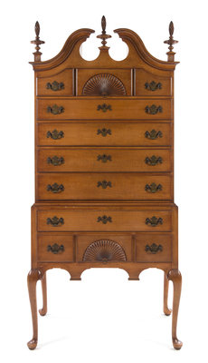 in two parts, the superstructure with three finials over three short drawers and four graduated long drawers, the base with a long drawer over three short drawers, the whole raised on cabriole legs.