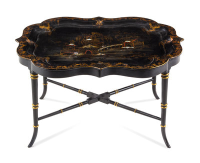 A Victorian Mother of Pearl Inset Lacquer Tray Width 32 inches.