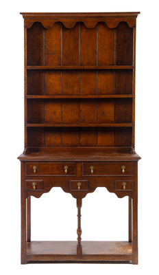in two parts, the superstructure with plate racks, the base set with drawers, raised on turned legs.
