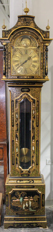 having a stepped cornice with five spherical finals over the brass dial having Roman hours and Arabic minutes, the case decorated with chinoiserie scenes throughout.