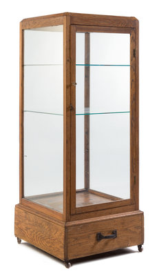An American Oak Retail Show Case Height 58 x width 22 x depth 22 inches.