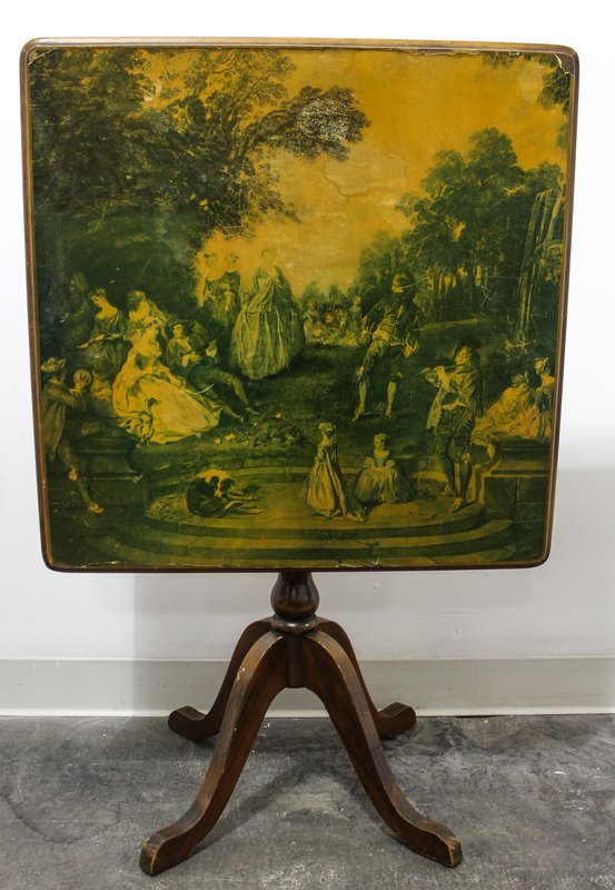 having a rectangular top decorated with a scene of a courting couple, label affixed to underside.