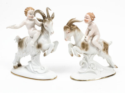 each in the form of a putto riding a goat, one example with transfer printed Gerold & Co. Tettau/ Bavaria to the underside.