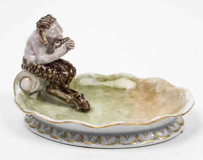 of oval form, modeled to show a seated Pan, with painted and transfer printed marks to the underside, further impressed K. Himmelstoss to the underside.