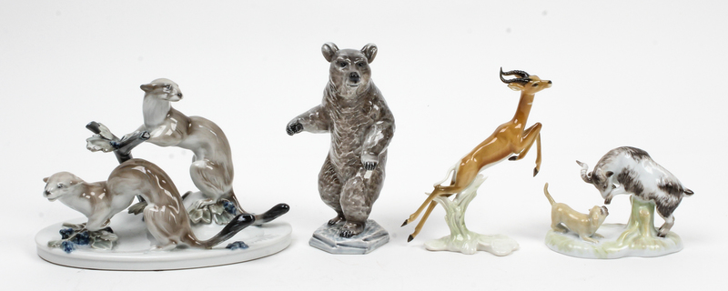 comprising a Rosenthal example modeled to show two ferrets; a Rosenthal example in the form of a bear on its hind legs; a Furstenberg example modeled to show a goat and a dog and a Hutschenreuther example in the form of an antelope, each with a transfer printed mark to the underside.