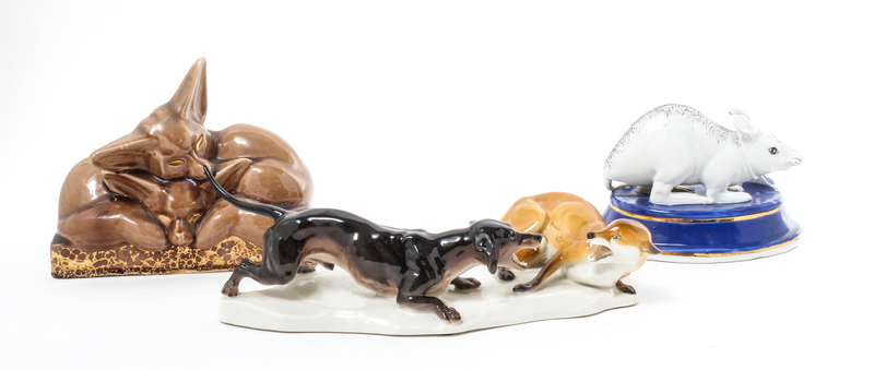 comprising a Sevres example modeled to show two sleeping foxes; a Nymphenburg example modeled to show a fighting hound and fox and a Continental example modeled to show a mouse raised on an oval base, each marked to the underside.