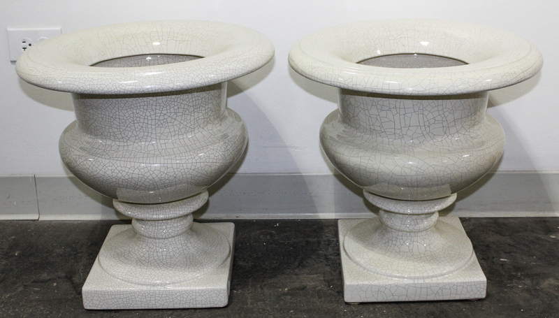 A Pair of Glazed Ceramic Urns Height 17 1/2 inches.