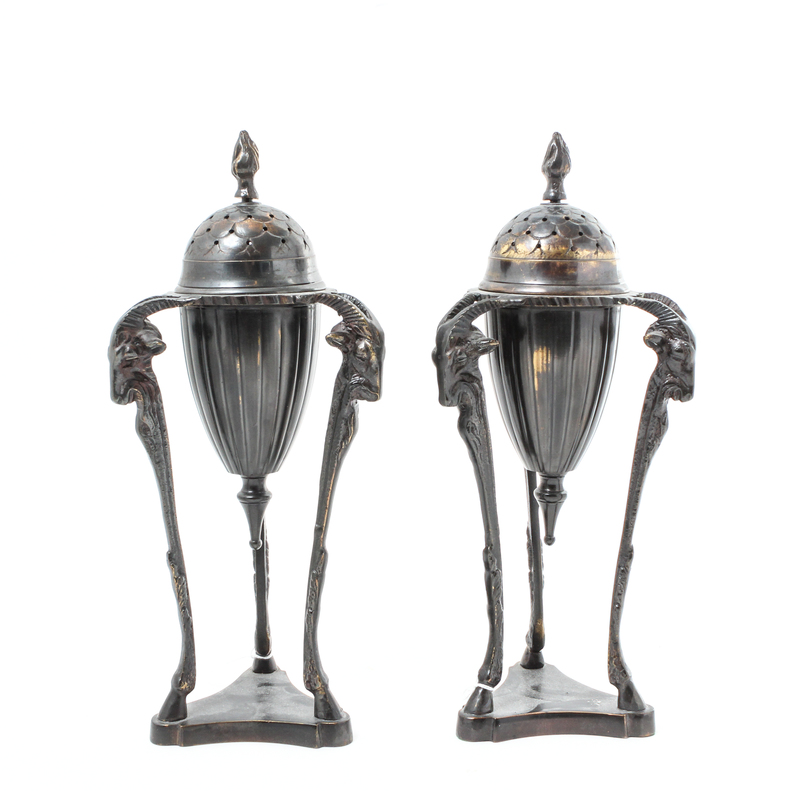 A Pair of Neoclassical Cast Metal Urns on Stand Height overall 11 3/4 inches.