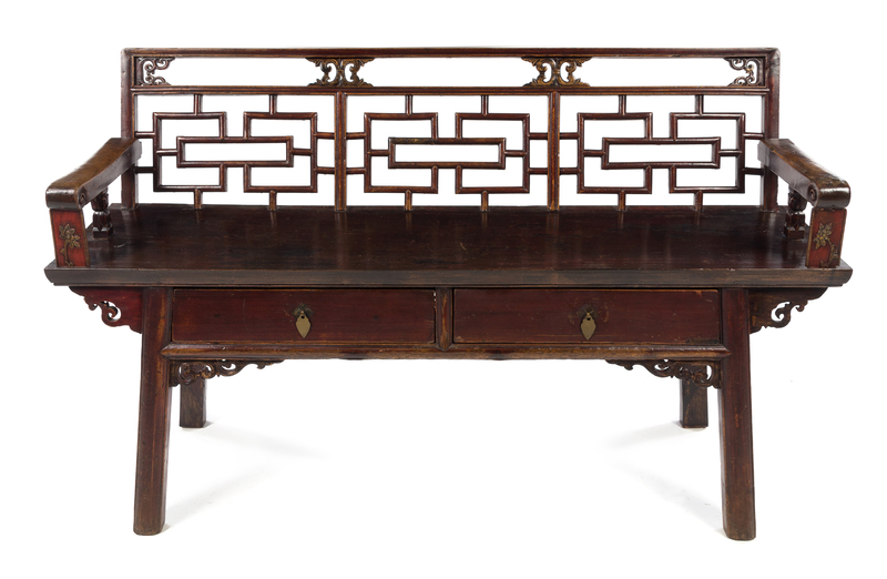 A Chinese Elmwood Bench Height 33 x width 56 1/2 x depth 16 inches.