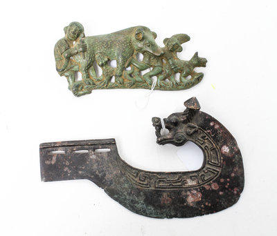 An Archaistic Patinated Metal Blade and a Buckle Fitting Width of first 8 inches.