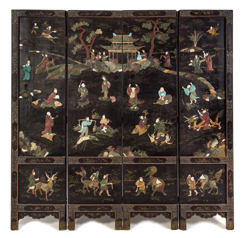 A Chinese Hardstone Inlaid Lacquer Screen Height 67 1/2 x width of each panel 16 1/2 inches.