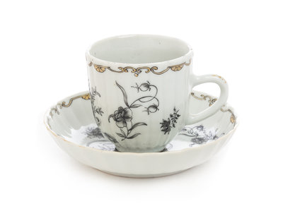 A Chinese Export Grisaille Porcelain Cup and Saucer Diameter of saucer 4 3/4 inches.