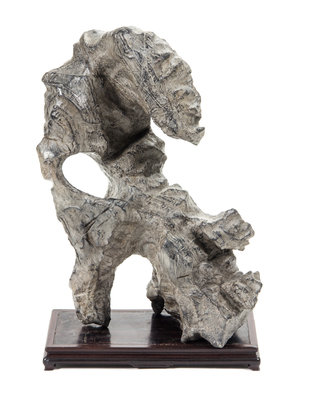 of dark slate grey stone with white striations and naturally pierced formations, raised on a hardwood stand.