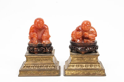 A Pair of Chinese Carved Carnelian Agate Figures Height overall 5 inches.