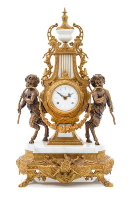 having an urn form finial over the lyre form case centered with circular enamel dial, with Roman numerals, flanked by youthful satyrs.