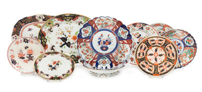 each decorated in the Imari palette, comprising 2 oval serving trays, 6 plates of various forms and sizes and an oval serving dish, some items with transfer-printed marks to the underside; 10 items total.