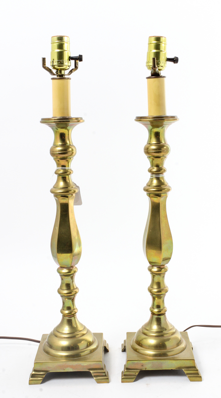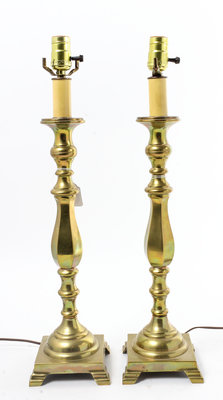 A Pair of Brass Candlesticks Height overall 27 inches.