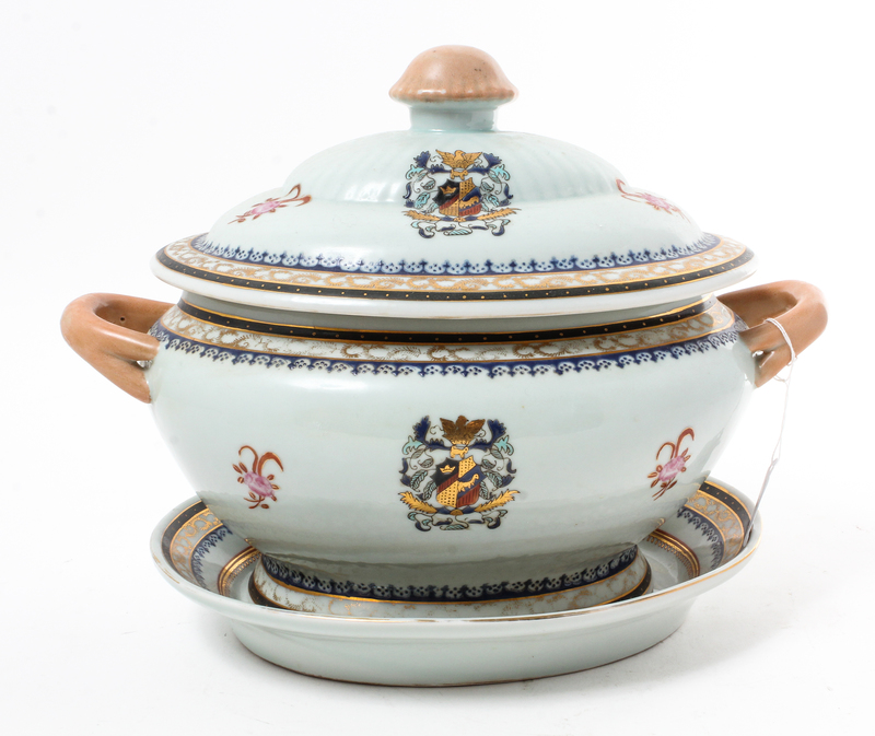 A Chinese Export Style Porcelain Tureen, Reed & Barton Width over handles 15 1/2 inches.