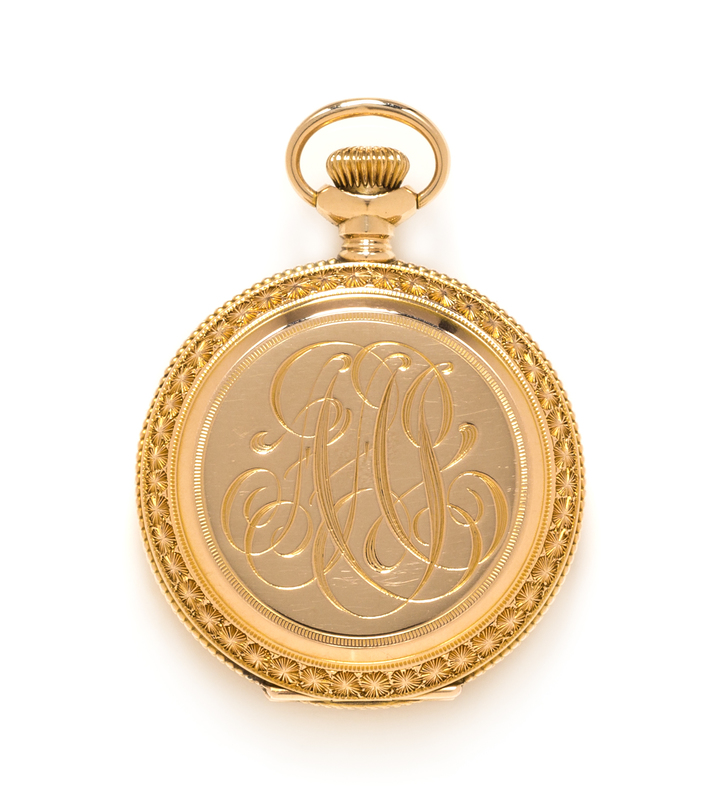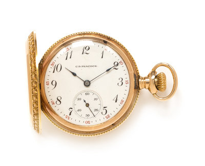 34.00 mm case diameter, white single-sunk dial signed C.D. PEACOCK, Arabic numerals with red outer chapter ring calibrated to 60 units, blued steel spade hands, subdial for seconds at six o'clock, personalized cuvette, monogrammed case with polished case back, engraved and hobnail detail bezel, stem wound and set 7 jewel nickel movement with damaskeen detail signed ELGIN WATCH CO.Movement number: 10385069.Case stamp: 14K 84552.