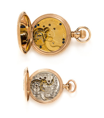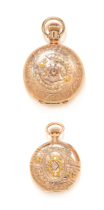 A Collection of Tricolor Gold Filled, Diamond and Ruby Hunter Case Pocket Watches, Elgin, Circa 1890 and 1899,