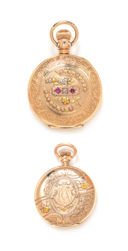 consisting of a pocket watch, circa 1899, 34.00 mm case diameter, white single-sunk dial signed Elgin, Roman numerals, blued steel spade hands, subdial for seconds at 6 o'clock, polished cuvette, outer case with intricately foliate motif pattern containing one old mine cut diamond and monogrammed cartouche, stem wound and set 15 jewel nickel movement with damaskeen finish signed Elgin Nat'l Watch Co, together with a pocket watch, circa 1890, 41.00 mm case diameter, white single-sunk dial signed ELGIN, gilt Louis XV hands, subdial for seconds at 6 o'clock, polished cuvette, outer case intricately engraved foliate case with floral motif containing two round cut rubies and one old mine cut diamond, stem wound and lever set 11 jewel gilt movement signed Elgin Natl Watch Co.Movement number: 7521655.Movement number: 3937907.