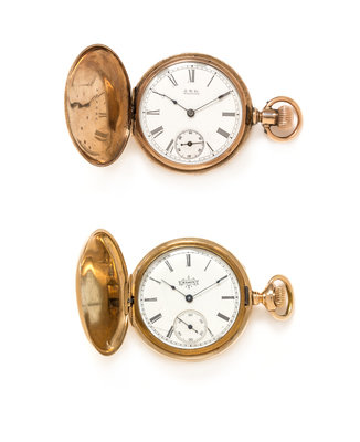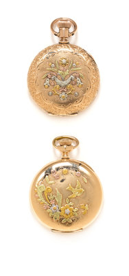 consisting of a pocket watch, circa 1895, 40.00 mm case diameter, white single-sunk dial signed ELGIN, Arabic numerals, blued steel spade hands, subdial for seconds at 6 o'clock, polished cuvette, floral and swallow motif case with blank cartouche, stem wound and set 11 jewel gilt movement signed Elgin Nat'l Watch Co., together with a pocket watch, circa 1889, 40.00 mm case diameter, white single-sunk dial signed A.W.Co. Waltham, Arabic numerals, blued steel spade hands, subdial for seconds at 6 o'clock, polished cuvette, floral motif case with blank cartouche, stem wound and set 7 jewel gilt movement signed American Waltham Watch Co.Movement number: 5727086.Movement number: 4694796.