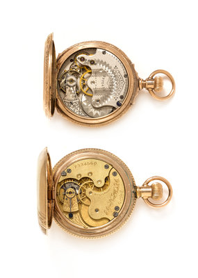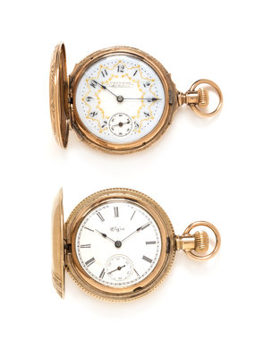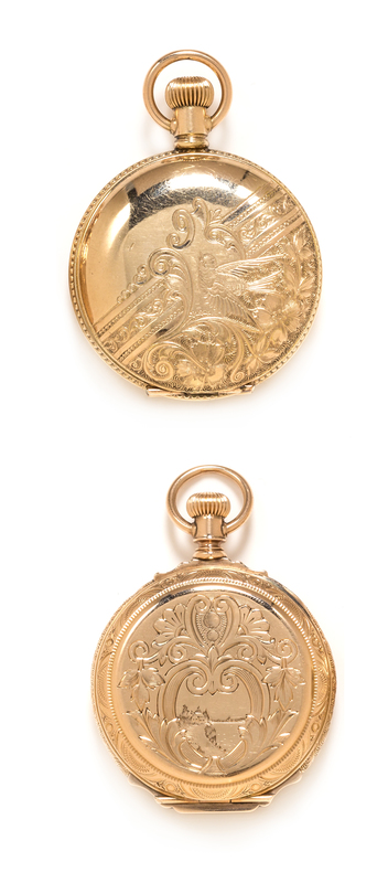 consisting of a pocket watch, circa 1898, 36.00 mm case diameter, white single-sunk dial signed Elgin, Roman numerals, blue steel spade hands, subdial for seconds at six o'clock, polished 14 karat gold cuvette, asymmetrical engraved case with swallow motif, stem wound and set 7 jewel gilt movement signed Elgin Natl. Watch Co., together pocket watch, circa 1889, 35.00 mm case diameter, white single-sunk dial with gilt accents and light blue outer ring signed AMERICAN Waltham, Arabic numerals, blued steel spade hands, subdial for seconds at 6 o'clock, polished cuvette, foliate motif engraved case with village scene and monogrammed cartouche, stem wound and set 9 jewel nickel movement with damaskeen finish signed AMERICAN WALTHAM WATCH CO.Movement number: 7334560.Movement number: 3975473.