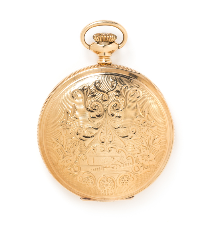48.00 mm case diameter, white single-sunk dial signed Elgin, Arabic numerals, blued steel spade hands, subdial for seconds at 6 o'clock, engine turned case with foliate motif and monogrammed cartouche, polished cuvette, stem wound and set 15 jewel nickel movement with fausses cotes finish signed ELGIN.Movement number: 24992629.