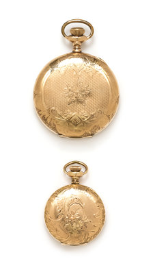 including a Waltham, circa 1903, 50.00 mm case diameter, white single-sunk dial signed WALTHAM, Arabic numerals with red outer chapter ring calibrated to 60 units, blued steel spade hands, subdial for seconds at six o'clock, polished cuvette, straight line engine turned case with floral engraved central and outer motif, stem wound and set 17 jewel nickel movement signed A.W.W. Co., together with an Elgin, circa 1909, 35.00 mm in diameter, white single-sunk dial with light blue center and gilt accents signed ELGIN, Arabic numerals with outer chapter ring calibrated to 60 units, gilt Louis XV hand, polished cuvette, foliate engraved case with monogrammed cartouche, subdial for seconds at six o'clock, stem wound and set 15 jewel nickel movement with damaskeen finish signed Elgin Nat'l Watch Co.Movement number: 12669309.Movement number: 13830619.