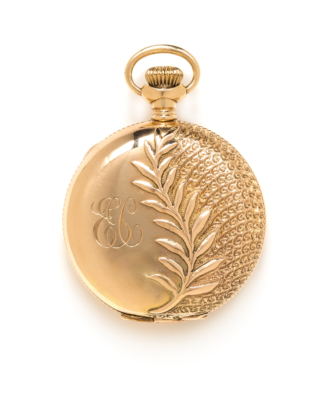 34.00 mm case diameter, white single-sunk dial signed Traub Bros. & Co., Roman numerals with red outer chapter ring calibrated to 60 units, blued steel spade hands, subdial for seconds at six o'clock, personalized gold cuvette, asymmetrical polished and engraved foliate motif case, stem wound and set 17 jewel nickel movement with damaskeen finish.Movement number: 6521066.Case stamp: 14K 94549.