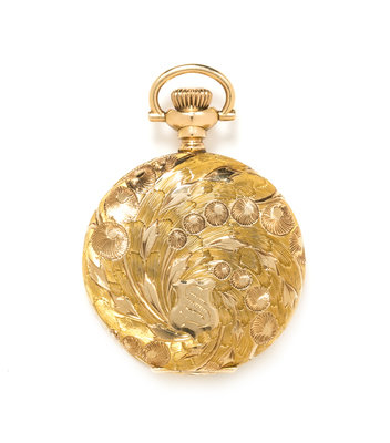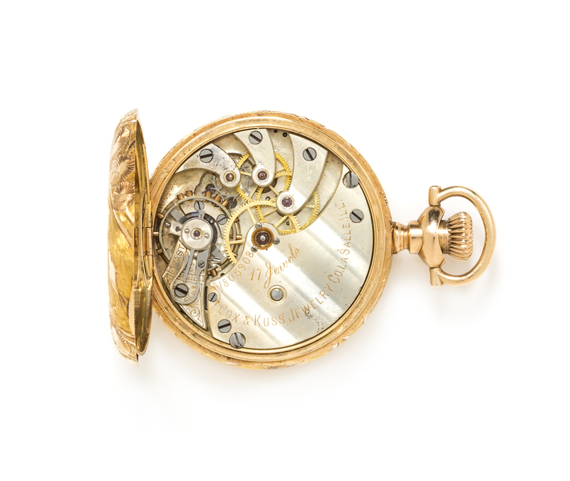 32.00 mm case diameter, white single-sunk dial signed Cox & Kuss Jewelry Co., Roman numerals, blued steel poire hands, subdial at six o'clock, personalized cuvette, intricately engraved foliate motif case with monogrammed cartouche, hinged case back, stem wound and set 17 jewel nickel movement signed COX & KUSS JEWELRY CO.Movement number: 1805908.Case stamp: 14K 6316712.
