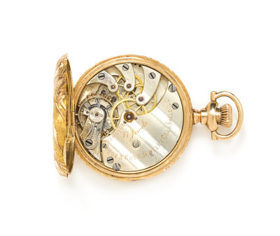 A 14 Karat Yellow Gold Hunter Case Pocket Watch, Cox & Kuss Jewelry Co.,